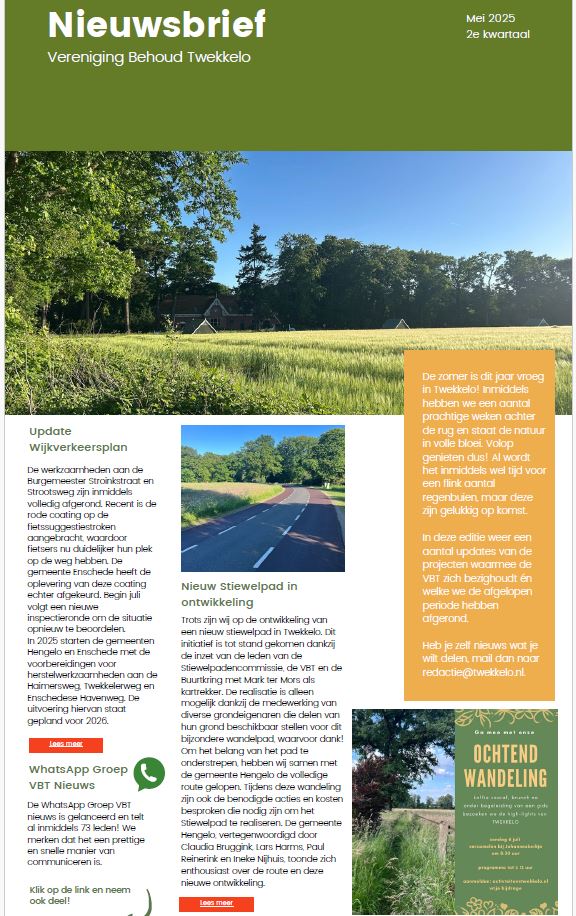 ieder kwartaal verschijnt de nieuwsbrief Twekkelo met updates over de laatste ontwikkelingen in ons buurtschap. Wil je deze ook ontvangen? Registreer je dan hier.